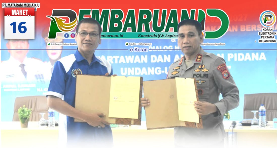 Diketahui, penandatanganan Surat Kesepakatan Bersama (SKB) oleh Kapolda Lampung Irjen Pol Akhmad Wiyagus, Kepala Kejati Lampung Nanang Sigit Yulianto, dan Ketua PWI Lampung Wirahadikusumah terkait perlindungan wartawan profesional.