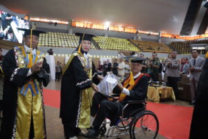 Prof. Dr. Eddy Rifai, S.H., M.H yang masih dalam kondisi sakit terpaksa mengenakan kursi roda selama prosesi pengukuhan.